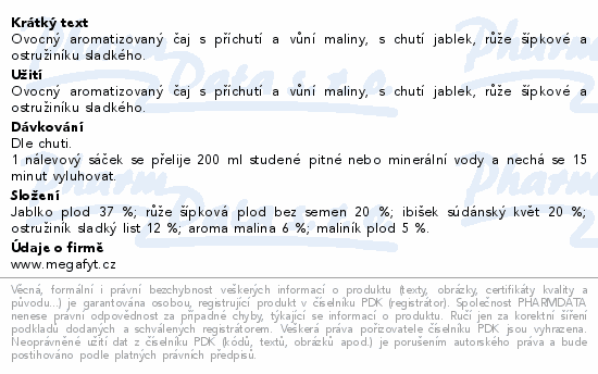 Ovocný aromatizovaný čaj s příchutí a vůní maliny, s chutí jablek, růže šípkové a ostružiníku sladkého.