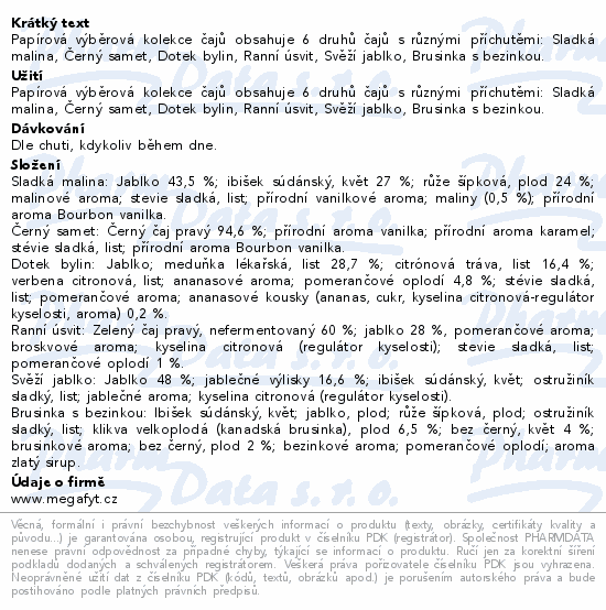Papírová výběrová kolekce čajů obsahuje 6 druhů čajů s různými příchutěmi: Sladká malina, Černý samet, Dotek bylin, Ranní úsvit, Svěží jablko, Brusinka s bezinkou.