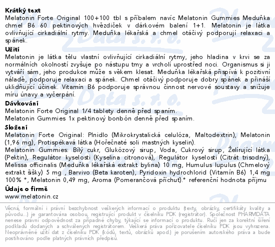 Melatonin Forte Original 100+100 tbl s příbalem navíc Melatonin Gummies Meduňka chmel B6 60 pektinových hvězdiček v dárkovém balení 1+1. Melatonin je látka ovlivňující cirkadiální rytmy. Meduňka lékařská a chmel otáčivý podporují relaxaci a spánek.