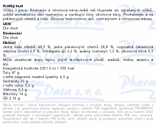 Oříšky z pece- Rozmarýn a citronová tráva-Ještě než křupnete do vypečených oříšků, ucítíte aromatickou vůni rozmarýnu a osvěžující tóny citronové trávy. Pochutnejte si na pekanových ořechů a kešu, růžovou hrubozrnnou solí, rozmarýnem a citronovou trávou.