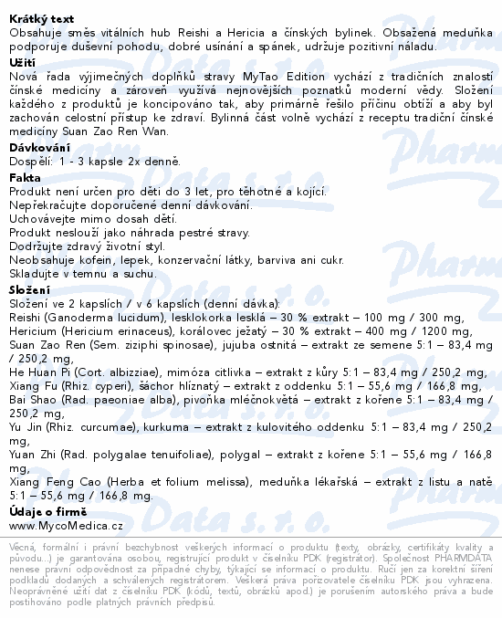 Obsahuje směs vitálních hub Reishi a Hericia a čínských bylinek. Obsažená meduňka podporuje duševní pohodu, dobré usínání a spánek, udržuje pozitivní náladu.
