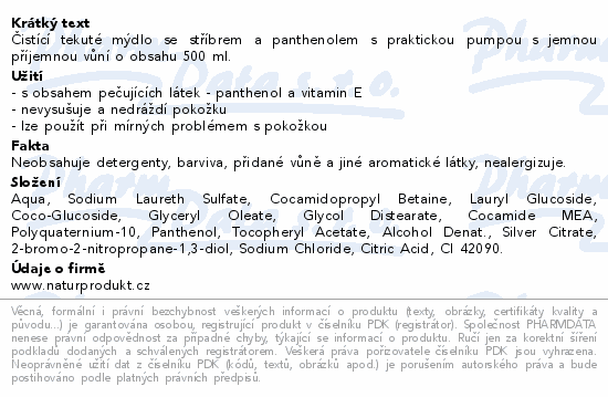 Čistící tekuté mýdlo se stříbrem a panthenolem s praktickou pumpou s jemnou příjemnou vůní o obsahu 500 ml.
