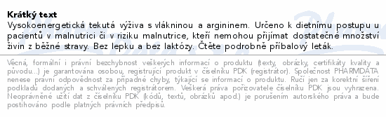 Vysokoenergetická tekutá výživa s vlákninou a argininem. Určeno k dietnímu postupu u pacientů v malnutrici či v riziku malnutrice, kteří nemohou přijímat dostatečné množství živin z běžné stravy. Bez lepku a bez laktózy. Čtěte pozorně příbalový leták.