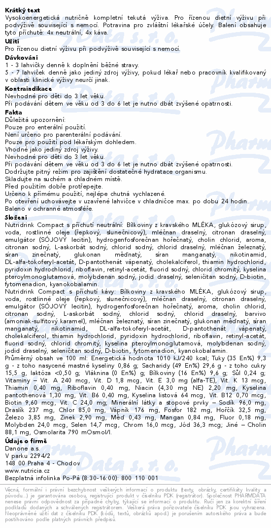 Nutridrink Compact je vysokoenergetická nutričně kompletní tekutá výživa. Potravina pro zvláštní lékařské účely. Pro...