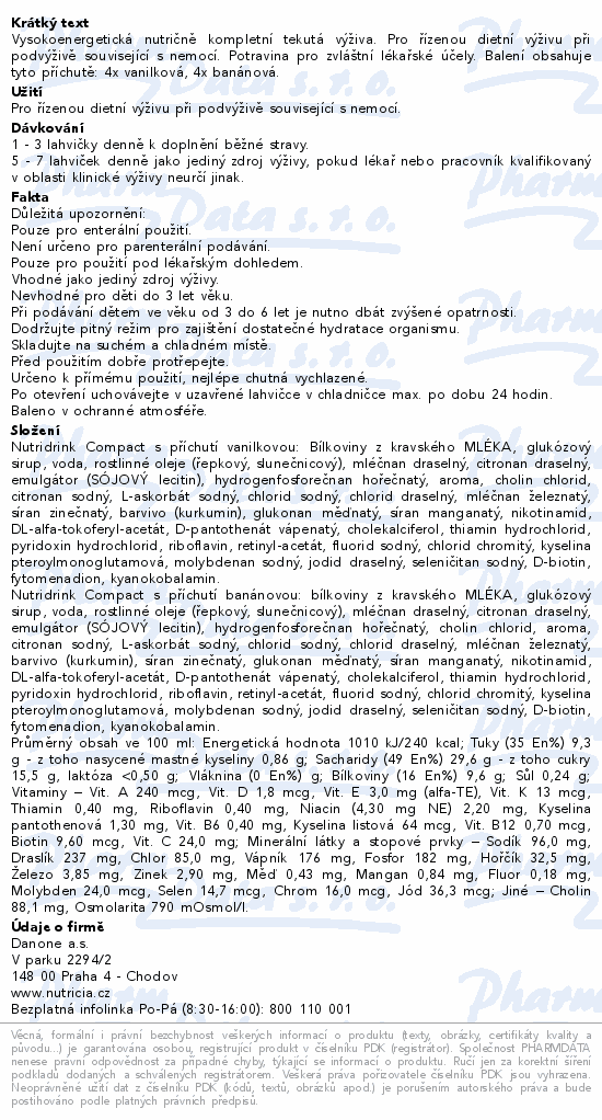 Nutridrink Compact je vysokoenergetická nutričně kompletní tekutá výživa. Potravina pro zvláštní lékařské účely. Pro...