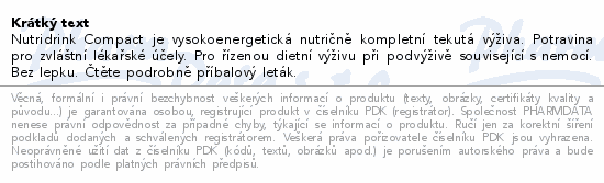 Nutridrink Compact je vysokoenergetická nutričně kompletní tekutá výživa. Potravina pro zvláštní lékařské účely. Pro řízenou dietní výživu při podvýživě související s nemocí. Bez lepku. Čtěte pozorně příbalový leták.