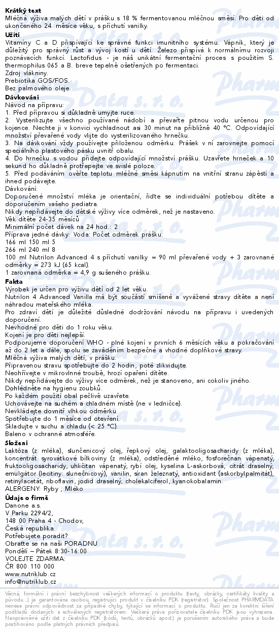 Mléčná výživa malých dětí v prášku s 18 % fermentovanou mléčnou směsí. Pro děti od ukončeného 24. měsíce věku, s příchutí vanilky.