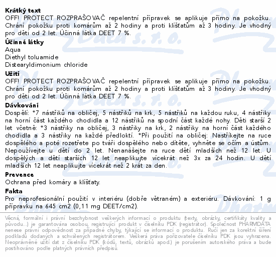 OFF! PROTECT ROZPRAŠOVAČ repelentní přípravek se aplikuje přímo na pokožku. Chrání pokožku proti komárům až 2 hodiny a proti klíšťatům až 3 hodiny. Je vhodný pro děti od 2 let. Účinná látka DEET 7 %.