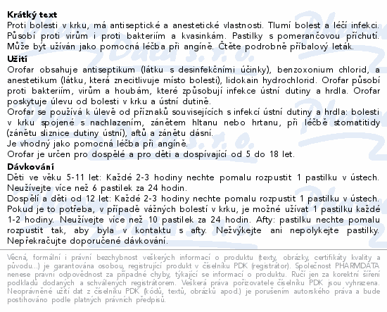 Proti bolesti v krku, má antiseptické a anestetické vlastnosti. Tlumí bolest a léčí infekci. Působí proti virům i proti bakteriím a kvasinkám. Pastilky s pomerančovou příchutí. Může být užíván jako pomocná léčba při angíně. Čtěte pozorně příbalový leták.