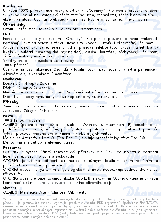 Unikátní 100% přírodní ušní kapky s aktivními "Ozonidy". Pro péči a prevenci o zevní zvukovod. Na akutní, chronický zánět zevního ucha, otomykózu, zánět blanky bubínku, ekzém, keratózu. Uvolňují přebytečný ušní maz. Rychle snižují zánět, infekci, bolest.