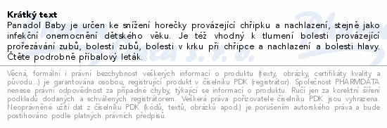 Panadol Baby je určen ke snížení horečky provázející chřipku a nachlazení, stejně jako infekční onemocnění dětského věku....