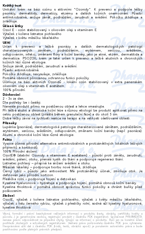 Unikátní krém na bázi ozónu s aktivními "Ozonidy". K prevenci a podpoře léčby psoriázy, dermatitidy, dermatózy, ekzému a dalších kožních onemocnění. Působí antimikrobiálně, snižuje zánět, podráždění, zarudnutí a svědění. Pokožku zklidňuje a zvláčňuje.