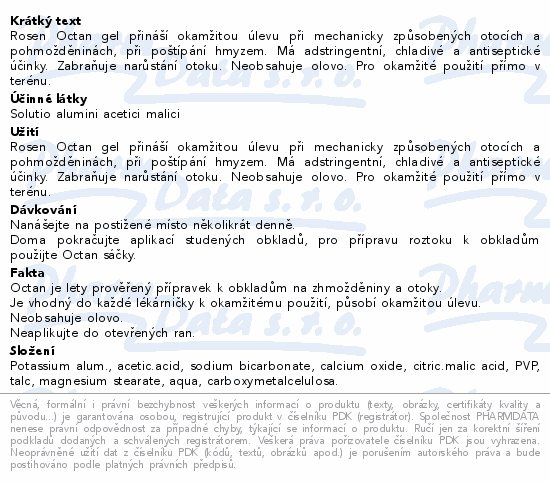 Rosen Octan gel přináší okamžitou úlevu při mechanicky způsobených otocích a pohmožděninách, při poštípání hmyzem. Má adstringentní, chladivé a antiseptické účinky. Zabraňuje narůstání otoku. Neobsahuje olovo. Pro okamžité použití přímo v terénu.