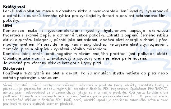 Lehká anti-pollution maska s obsahem nízko a vysokomolekulární kyseliny hyaluronové a extraktu z pupenů černého rybízu pro vynikající hydrataci a posílení ochranného filmu pokožky.