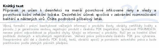 Přípravek je určen k desinfekci na menší povrchové infikované rány a vředy a povrchová kožní infekční ložiska. Dezinfekční...