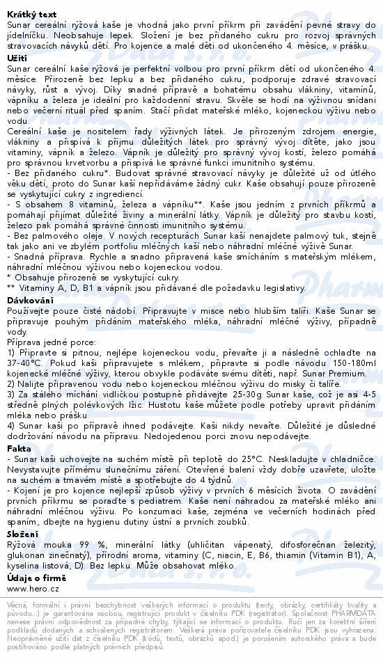 Sunar cereální rýžová kaše je vhodná jako první příkrm při zavádění pevné stravy do jídelníčku. Neobsahuje lepek. Složení je bez přidaného cukru pro rozvoj správných stravovacích návyků dětí. Pro kojence a malé děti od ukončeného 4. měsíce, v prášku.