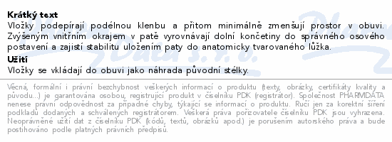 Vložky podepírají podélnou klenbu a přitom minimálně zmenšují prostor v obuvi. Zvýšeným vnitřním okrajem v patě vyrovnávají dolní končetiny do správného osového postavení a zajistí stabilitu uložením paty do anatomicky tvarovaného lůžka.