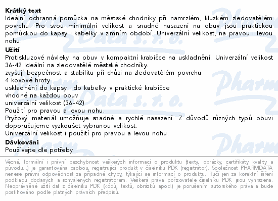 Ideální ochranná pomůcka na městské chodníky při namrzlém, kluzkém zledovatělém povrchu. Pro svou minimální velikost a snadné nasazení na obuv jsou praktickou pomůckou do kapsy i kabelky v zimním období. Univerzální velikost, na pravou i levou nohu.
