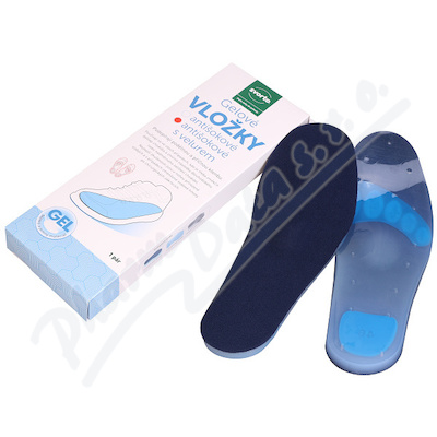 Vložky vyrobeny z měkkého silikonového gelu, podepírají podélnou a příčnou klenbu. Světlemodré měkčí plochy pod klouby prstů a patou změkčují došlap. Umožní snadné nazouvání do obuvi.