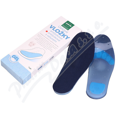 Vložky vyrobeny z měkkého silikonového gelu, podepírají podélnou a příčnou klenbu. Světlemodré měkčí plochy pod klouby prstů a patou změkčují došlap. Umožní snadné nazouvání do obuvi.