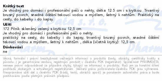 Je vhodný pro domácí i profesionální péči o nehty, délka 12.5 cm i s krytkou. Trvanlivý brusný povrch, snadné čištění tekoucí vodou a mýdlem, šetrný k nehtům. Praktický na cesty, do kabelky i do kapsy.