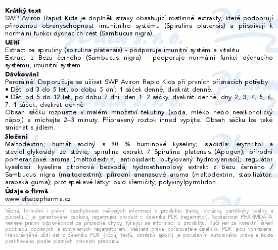 SWP Aviron Rapid Kids je doplněk stravy obsahující rostlinné extrakty, které podporují přirozenou obranyschopnost imunitního systému (Spirulina platensis) a přispívají k normální funkci dýchacích cest (Sambucus nigra).