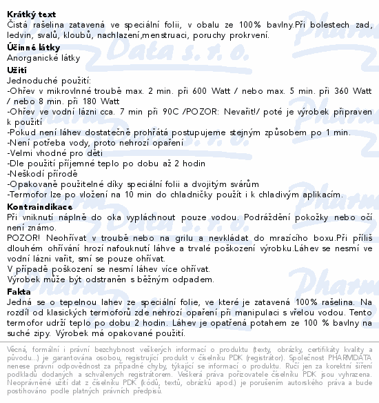 Čistá rašelina zatavená ve speciální folii, v obalu ze 100% bavlny.Při bolestech zad, ledvin, svalů, kloubů, nachlazení, menstruaci, poruchy prokrvení.