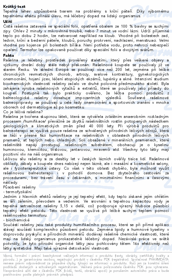 Čistá rašelina zatavená ve speciální folii, v obalu ze 100% bavlny.Při bolestech zad, ledvin, svalů, kloubů, nachlazení,...