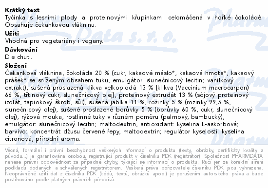 Tyčinka s lesními plody a proteinovými křupinkami celomáčená v hořké čokoládě. Obsahuje čekankovou vlákninu.