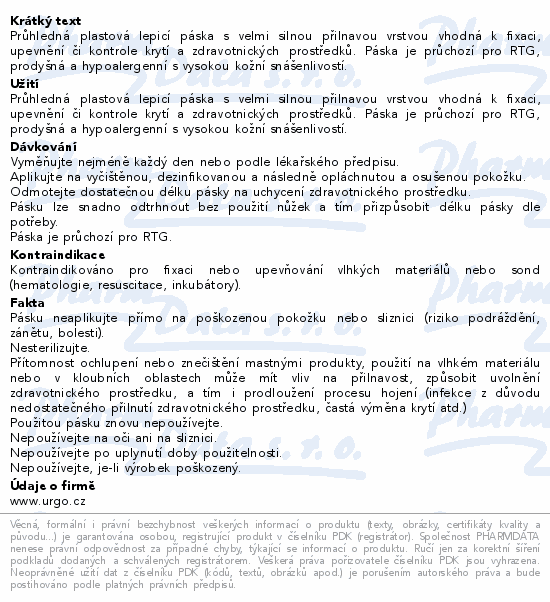 Průhledná plastová lepicí páska s velmi silnou přilnavou vrstvou vhodná k fixaci, upevnění či kontrole krytí a zdravotnických prostředků. Páska je průchozí pro RTG, prodyšná a hypoalergenní s vysokou kožní snášenlivostí.