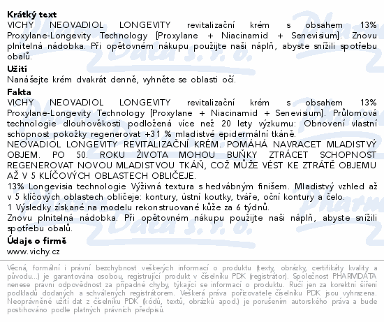 VICHY NEOVADIOL LONGEVITY revitalizační krém s obsahem 13% Proxylane-Longevity Technology [Proxylane + Niacinamid + Senevisium]....