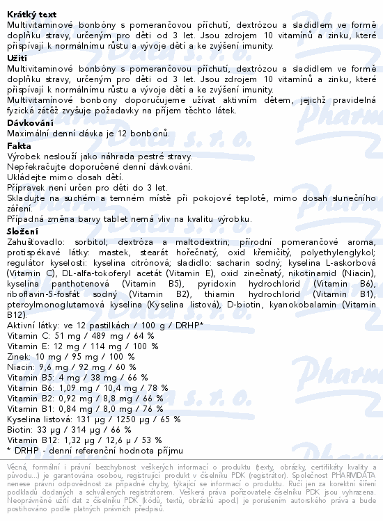 Multivitaminové bonbóny s pomerančovou příchutí, dextrózou a sladidlem ve formě doplňku stravy, určeným pro děti od 3 let. Jsou zdrojem 10 vitamínů a zinku, které přispívají k normálnímu růstu a vývoje dětí a ke zvýšení imunity.