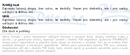 Espresso kávový drops, bez cukru, se sladidly. Nejen pro diabetiky, ale i pro osoby udržující si štíhlou linii.