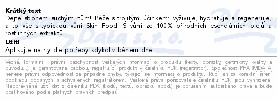Dejte sbohem suchým rtům! Péče s trojitým účinkem: vyživuje, hydratuje a regeneruje, a to vše s typickou vůní Skin Food. S vůní ze 100% přírodních esenciálních olejů a rostlinných extraktů.